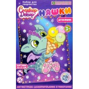 Детям от 3-х лет будет несложно создать картину с лакомкой-Дракошиком: нужно наклеить стикеры-бугорки гребня, стикеры-чешуйки и стикеры-подушечки на ножках, стикеры-ромбики и шарики мороженого - на изображение персонажа на фоне, затем наклеить голографические круги и звёзды на изображение планеты, на которой сидит Дракошик, заполнить пространство вокруг Дракошика и планеты голографическими стикерами, - и замечательная картина с ярким персонажем на фоне звёздного неба готова!