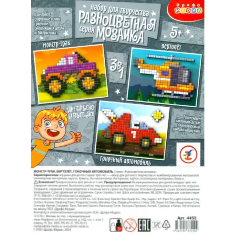 Набор для творчества от Дрофы Медиа 'Монстр-трак. Вертолёт. Гоночный автомобиль' обязательно понравится мальчикам! Это набор разноцветных мозаик, в котором три картинки: могучий монстр-трак, транспортный вертолёт и быстрый гоночный автомобиль.