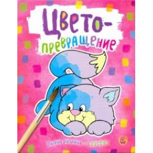 На крупные картинки с толстыми контурами нанесён узор из мелких цветных точек. Если провести мокрой кисточкой по картинке, она окрасится в разные цвета - совершенно неожиданные! Синий может стать розовым, красный - жёлтым, и наблюдать за этим цветопревращением ужасно увлекательно!