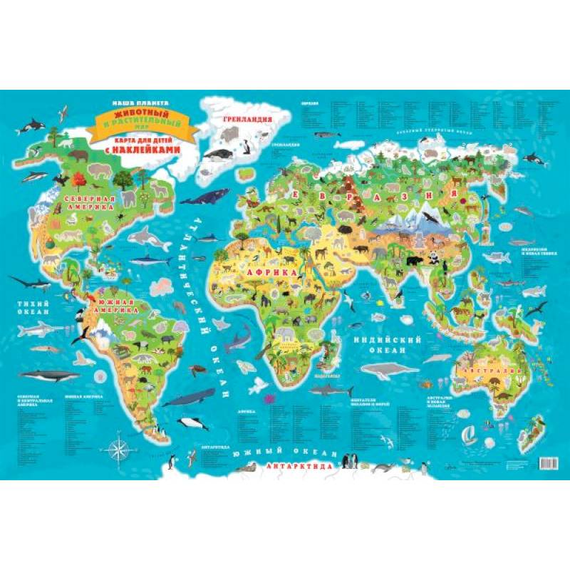 Карта наглядно представит внешний вид и  места обитания самых интересных представителей флоры и фауны планеты Земля. Яркие наклейки помогут детям лучше усвоить новые знания.