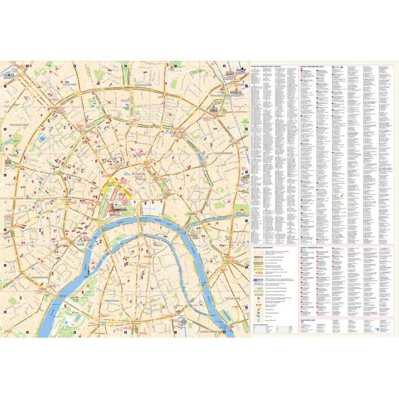 Складная карта размером 680х980 мм (в развёрнутом виде), 113,3х245 мм (в виде буклета). На одной стороне листа - карта Москвы, на другой стороне - краткий путеводитель с описанием основных музеев, театров, выставочных и концертных залов города. На карте наглядно представлена центральная, наиболее интересная в историческом, архитектурном и культурном смысле, часть Москвы в пределах Садового кольца. Цветом выделены основные транспортные магистрали города, некоторые интересные туристические объекты, выражаемые в масштабе карты, вокзалы, парки, водные объекты. НАЗВАНИЯ ОСНОВНЫХ МАГИСТРАЛЕЙ И СТАНЦИЙ МЕТРО ПРОДУБЛИРОВАНЫ НА АНГЛИЙСКОМ ЯЗЫКЕ, Театры, музеи и пр. показаны внемасштабными знаками. Некоторые известные здания и сооружения даны рисунками. Карта снабжена подробным указателем улиц и мостов, а также музеев, театров и других учреждений культуры. Основная карта дополнена схемой скоростного транспорта Москвы.